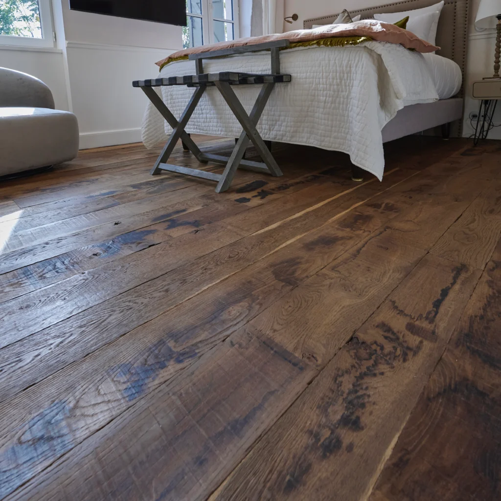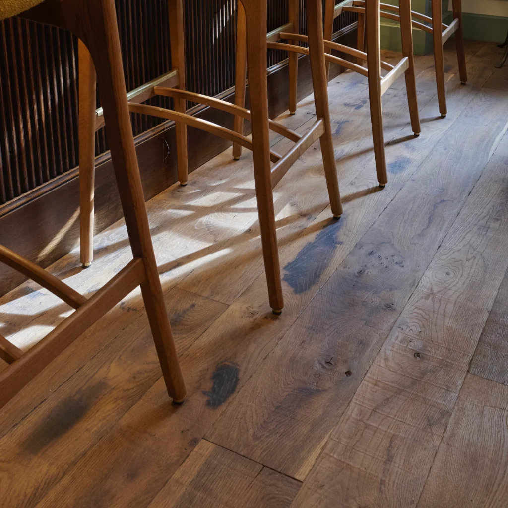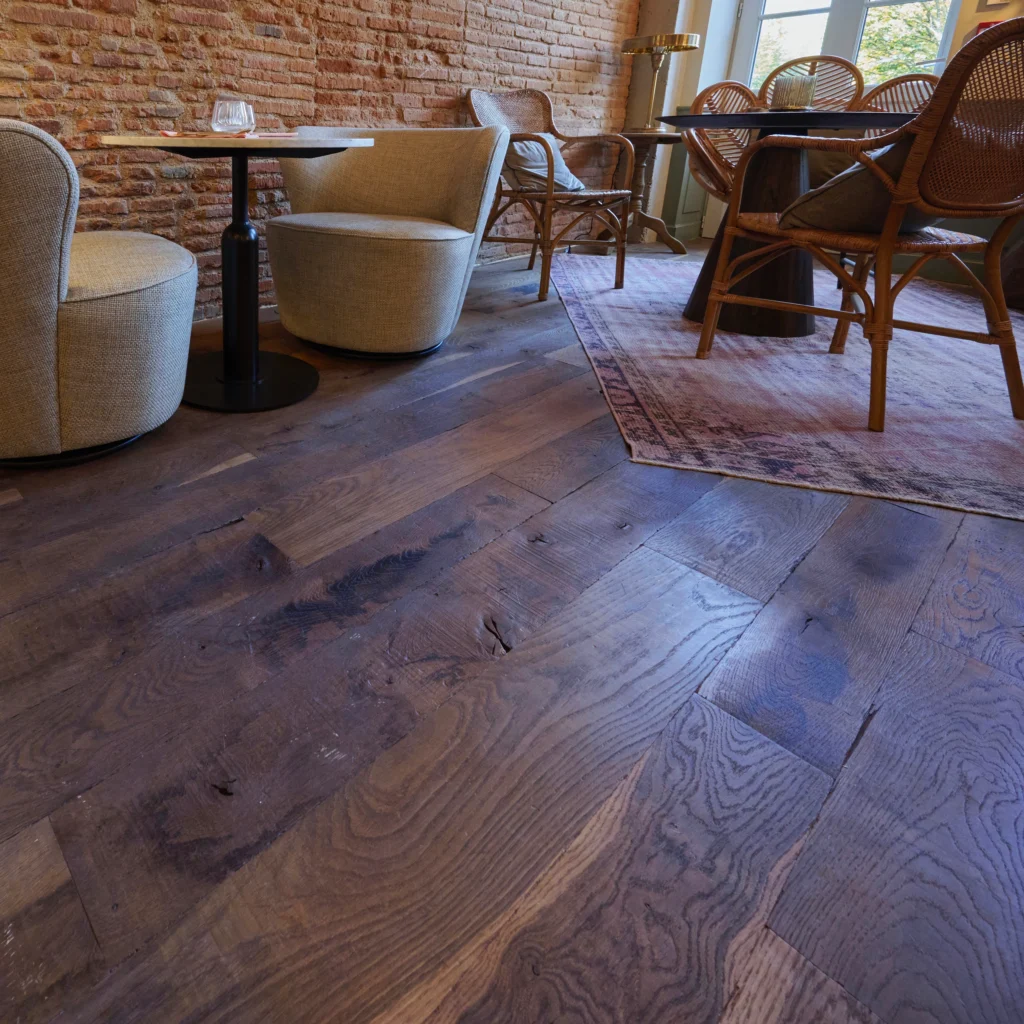 Dans les chambres comme dans la salle de restauration, ses lames larges déploient leurs nuances chaleureuses et leur veinage naturel.