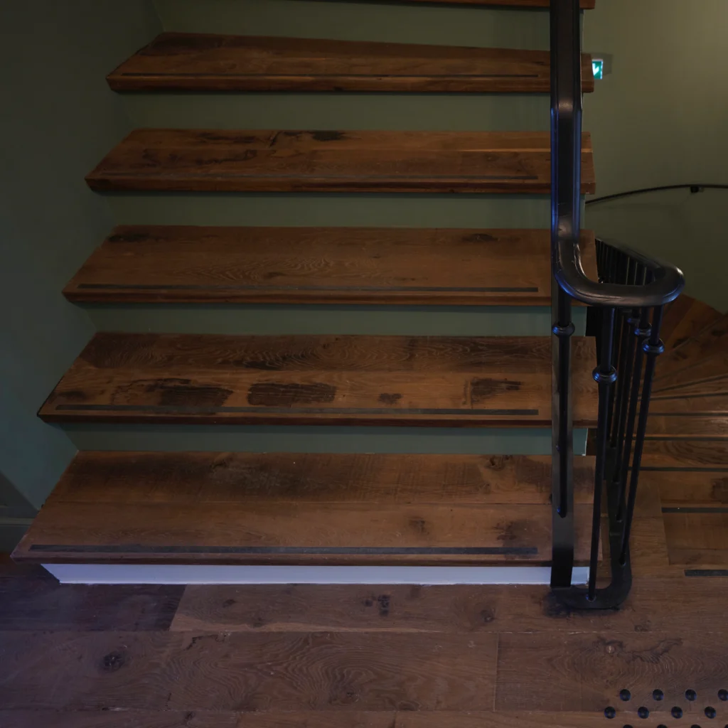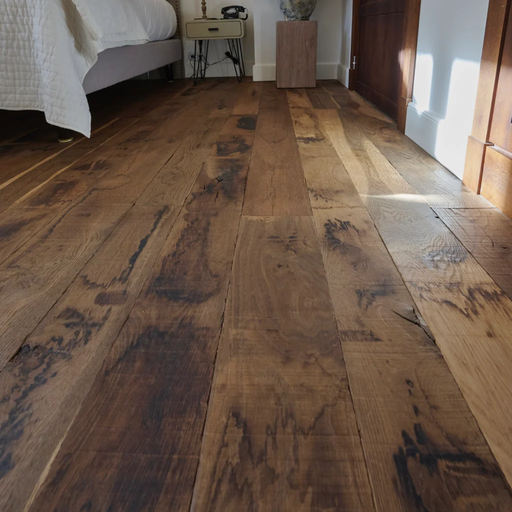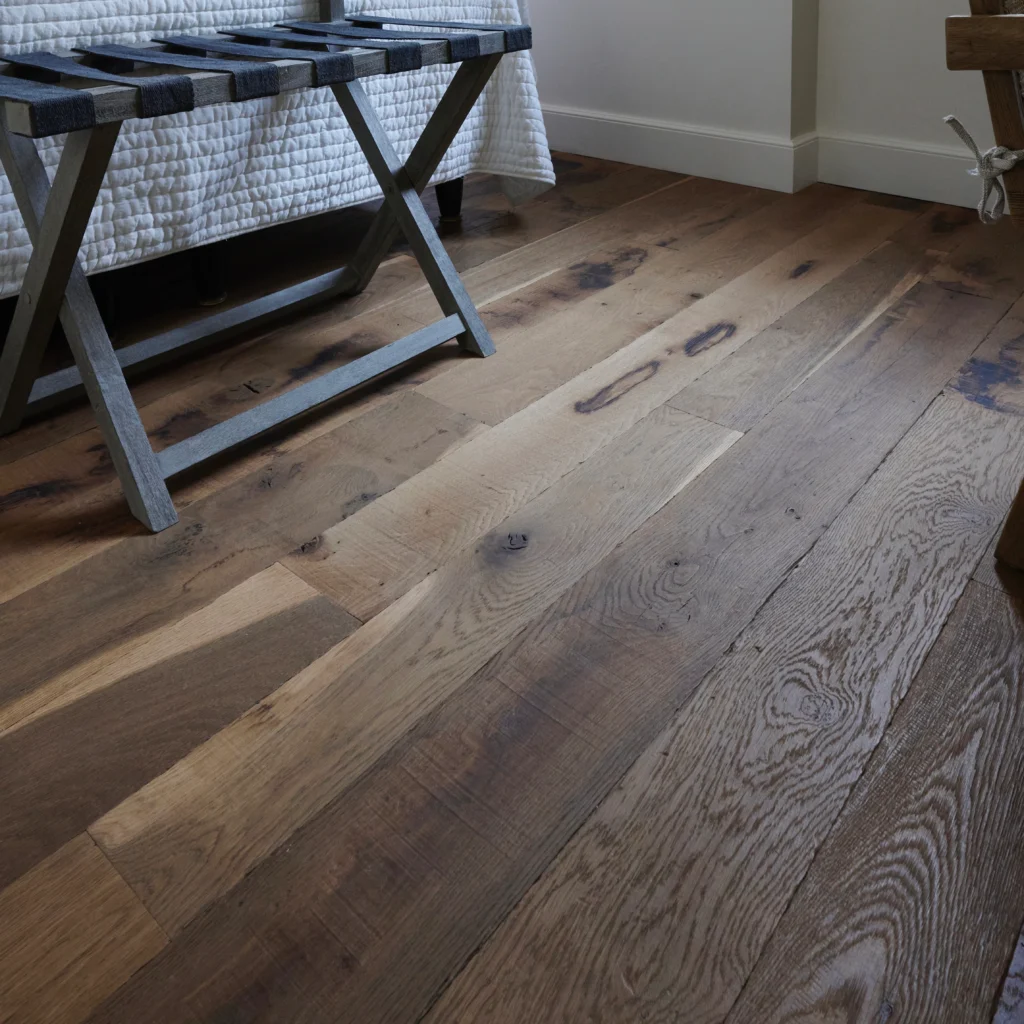 Dans les chambres comme dans la salle de restauration, ses lames larges déploient leurs nuances chaleureuses et leur veinage naturel.